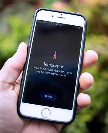 Du musst aber kein Thermometer zücken, um die Temperatur deines iPhones zu messen. Meist reicht hier eine Einschätzung nach Gefühl aus. Außerdem erkennt dein iPhone automatisch, wenn die Temperatur einen kritischen Punkt erreicht. Sobald ein iPhone überhitzt, erscheint für dich die Warnung „Das iPhone muss abkühlen, bevor es benutzt werden kann.“ Fortan lassen sich nur noch Notrufe ausführen, bis das Gerät abkühlt.